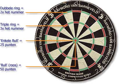 en Bull's eye (rood, 50 punten). Triple 20 is dus hoger dan de Bull's eye.